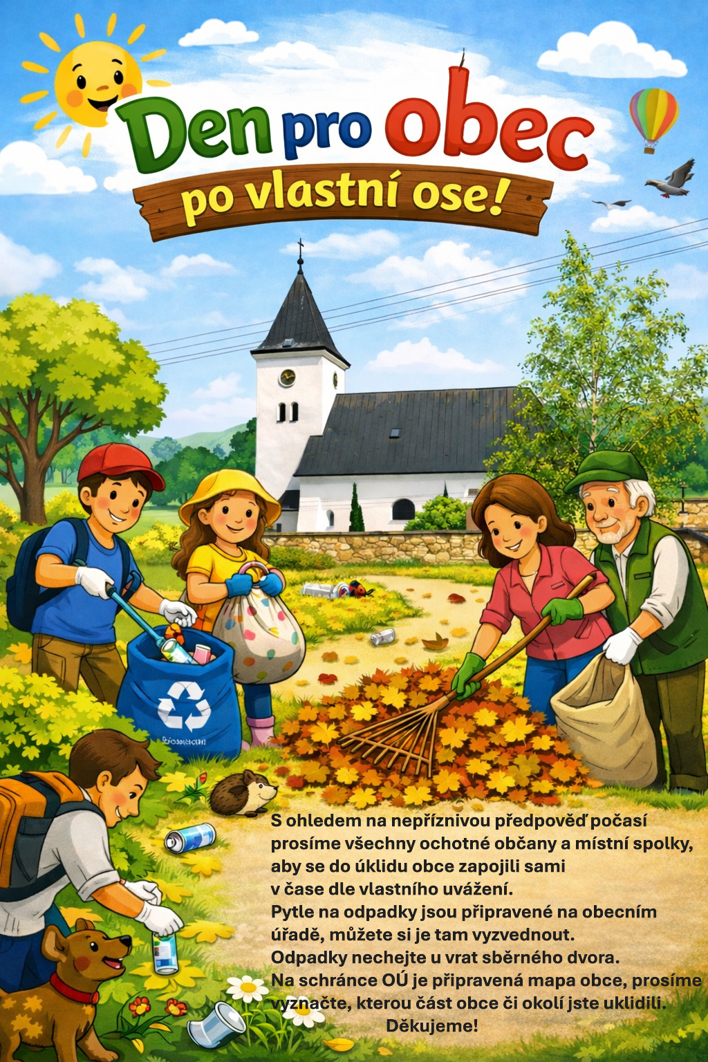 S ohledem na nepříznivou předpověď počasí prosíme všechny ochotné občany a místní spolky, aby se do úklidu obce zapojili sami v čase dle vlastního uvážení.