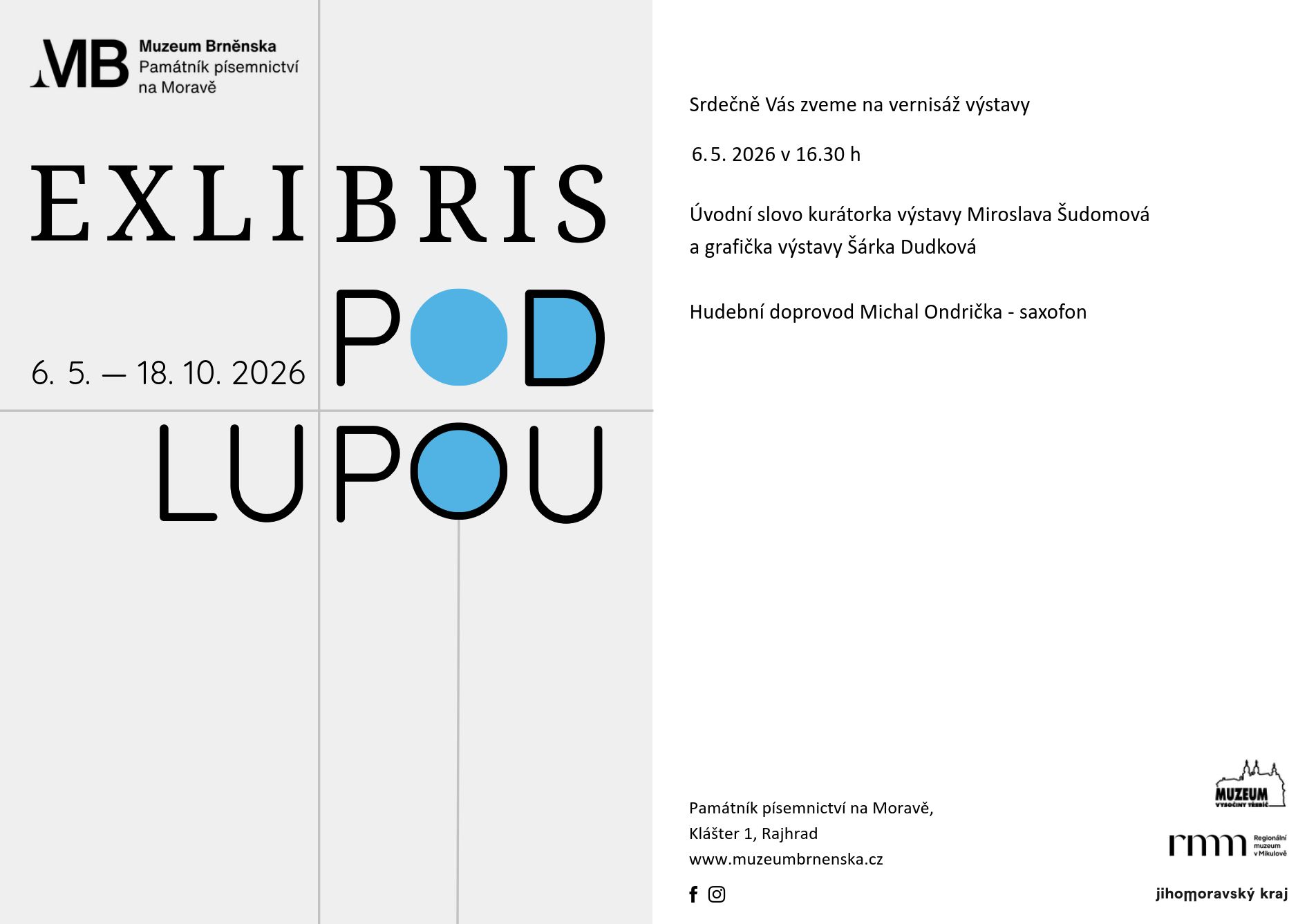 Úvodní slovo pronesou kurátorka výstavy Miroslava Šudomová a grafička Šárka Dudková, hudebního doprovodu se ujme saxofonista Michal Ondrička.